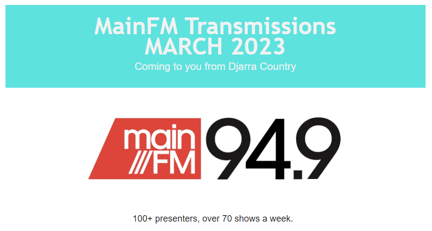 MainFM sends out a monthly email newsletter full of news and updates called ‘Transmissions’. If you’re not receiving it yet, follow this link to sign up.